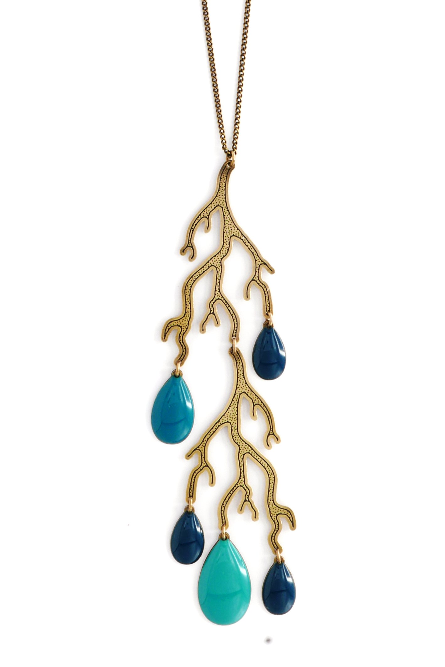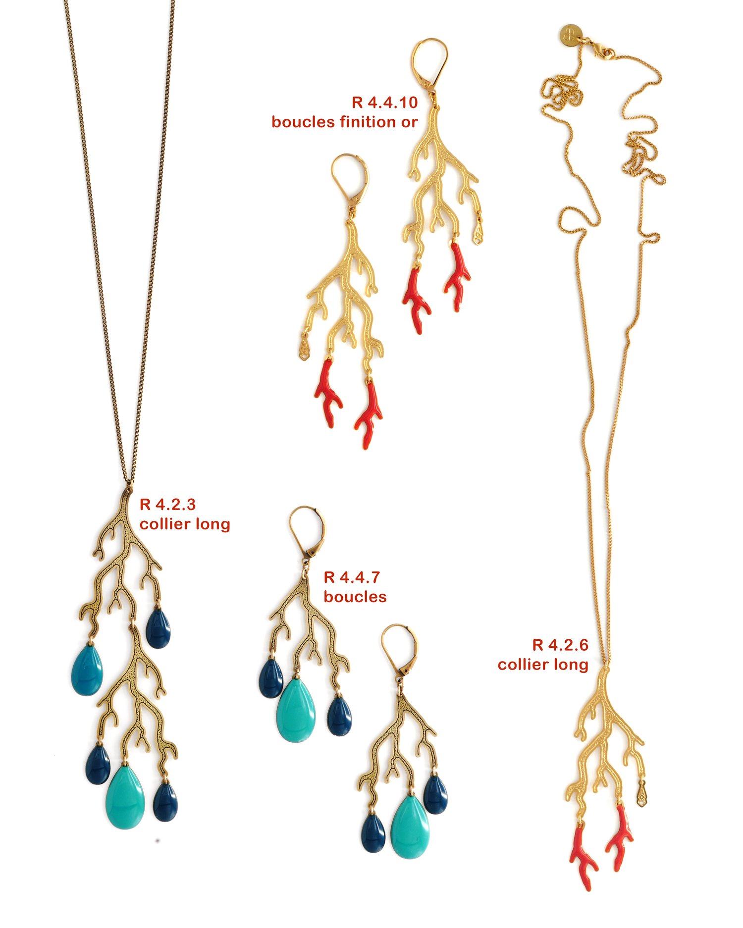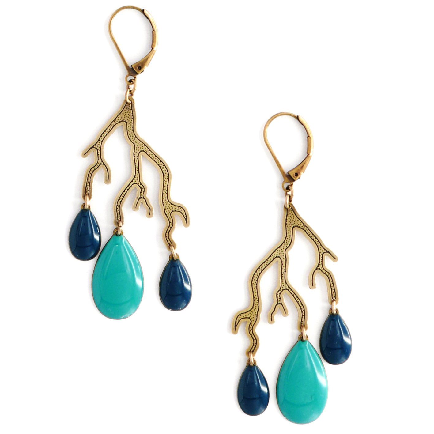 Bijoux en laiton gravé finition vieux bronze et résine couleur camaieu de bleus ou finition or et résine vermillon.