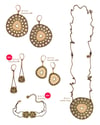 Bijoux en laiton gravé finition vieux bronze et inclusions de pièces en laiton gravé finition or.