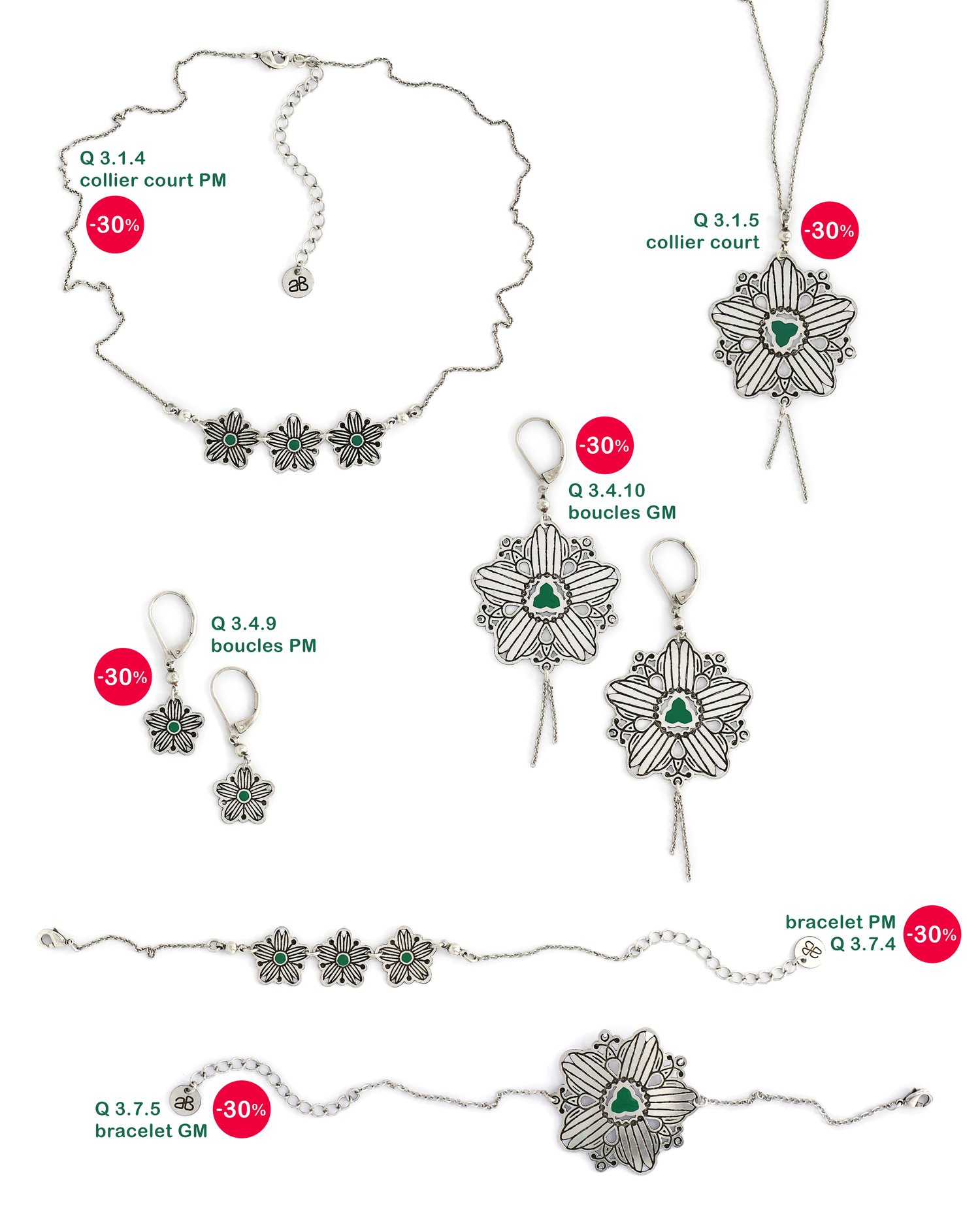 Bijoux en laiton gravé finition argent patiné et résine couleur vert émeraude