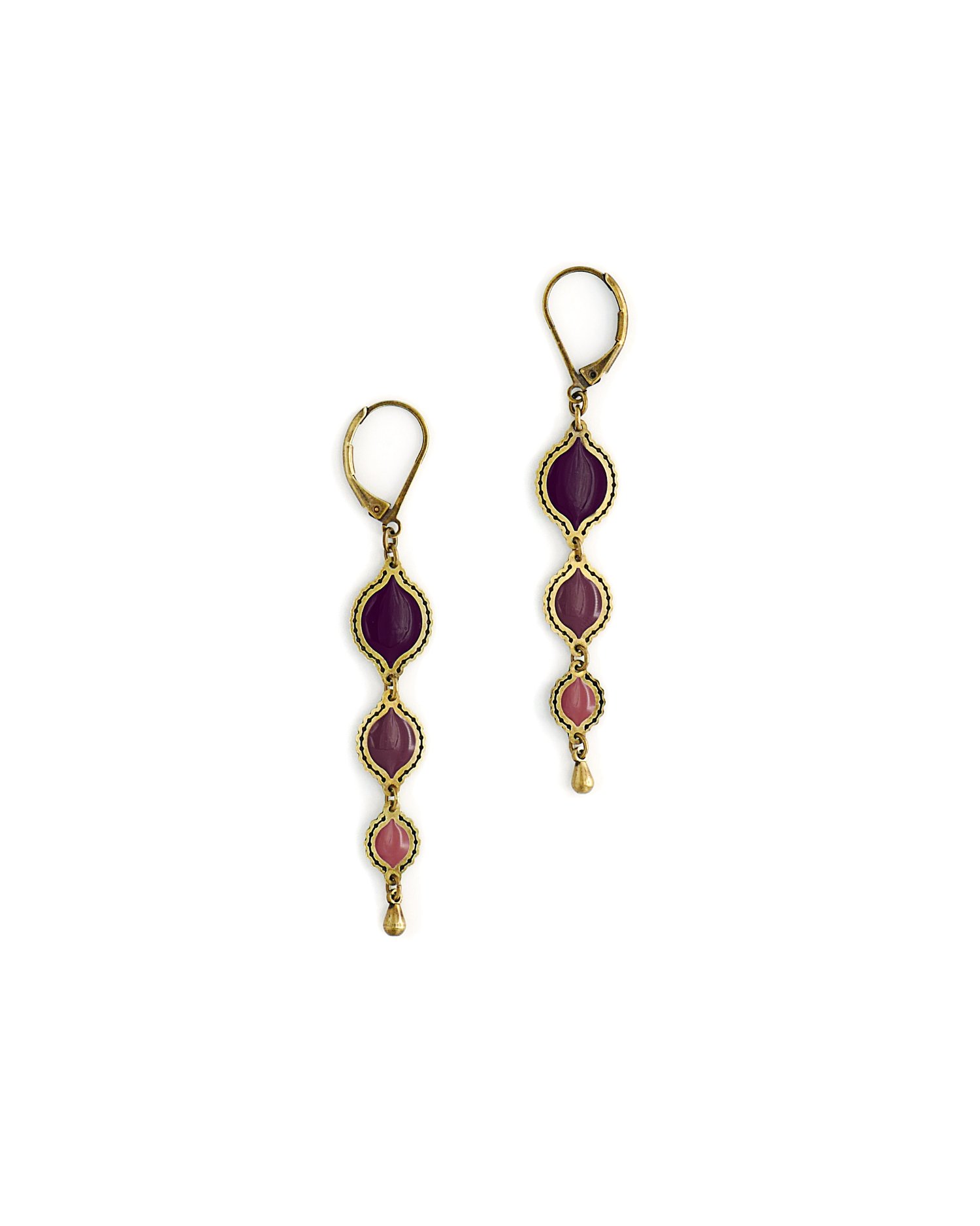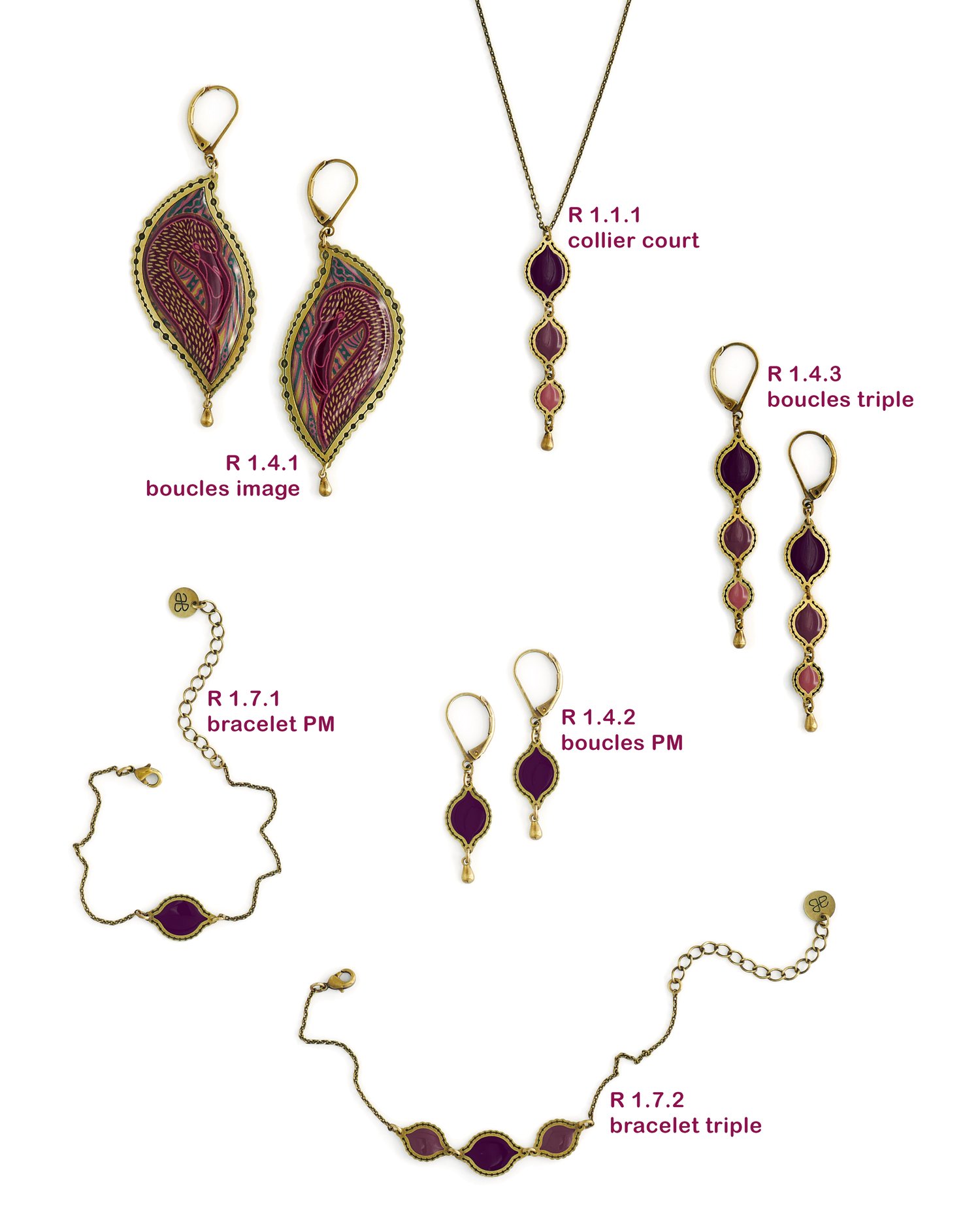 Bijoux en laiton gravé finition vieux bronze, camaïeu de résines colorées et images sous résine.