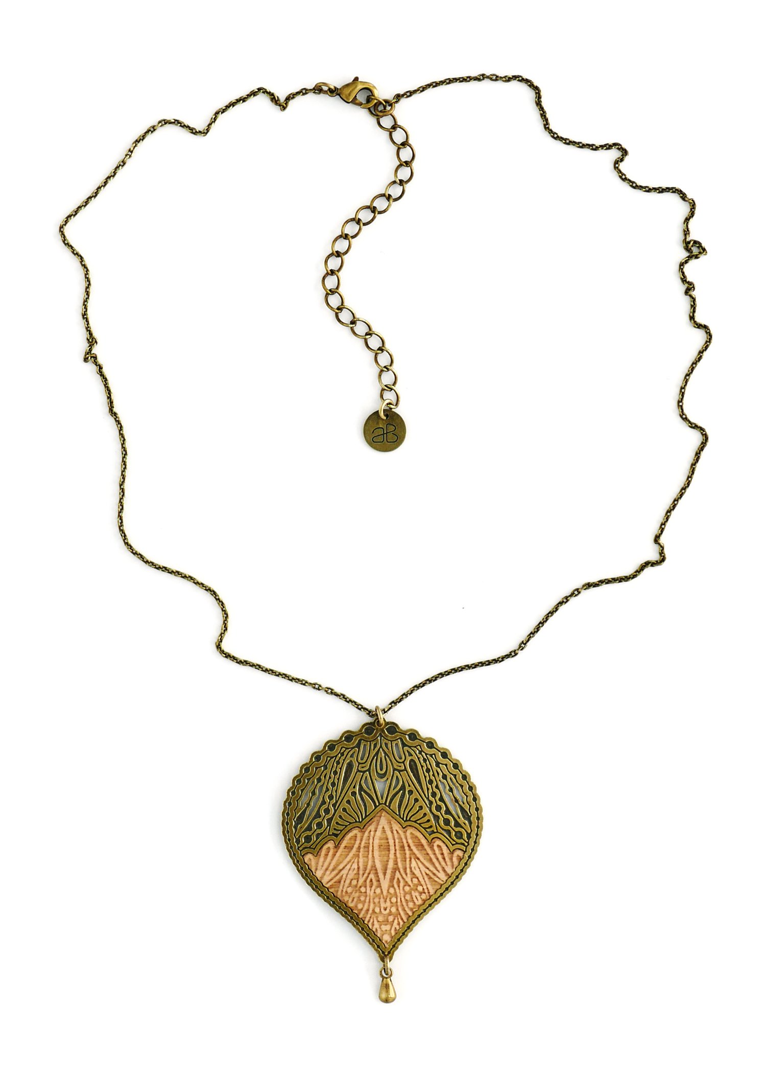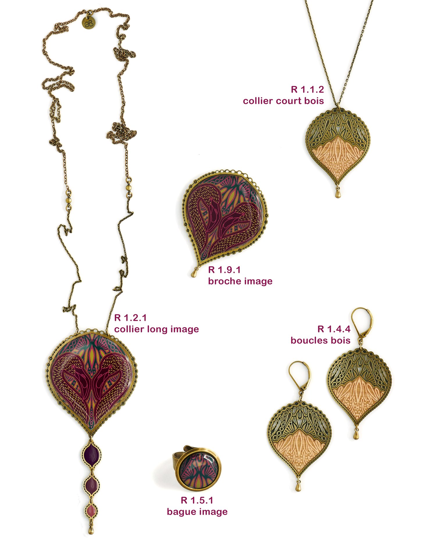 Bijoux en laiton gravé finition vieux bronze, camaïeu de résines, inclusions de bois gravé et d'images sous résine.