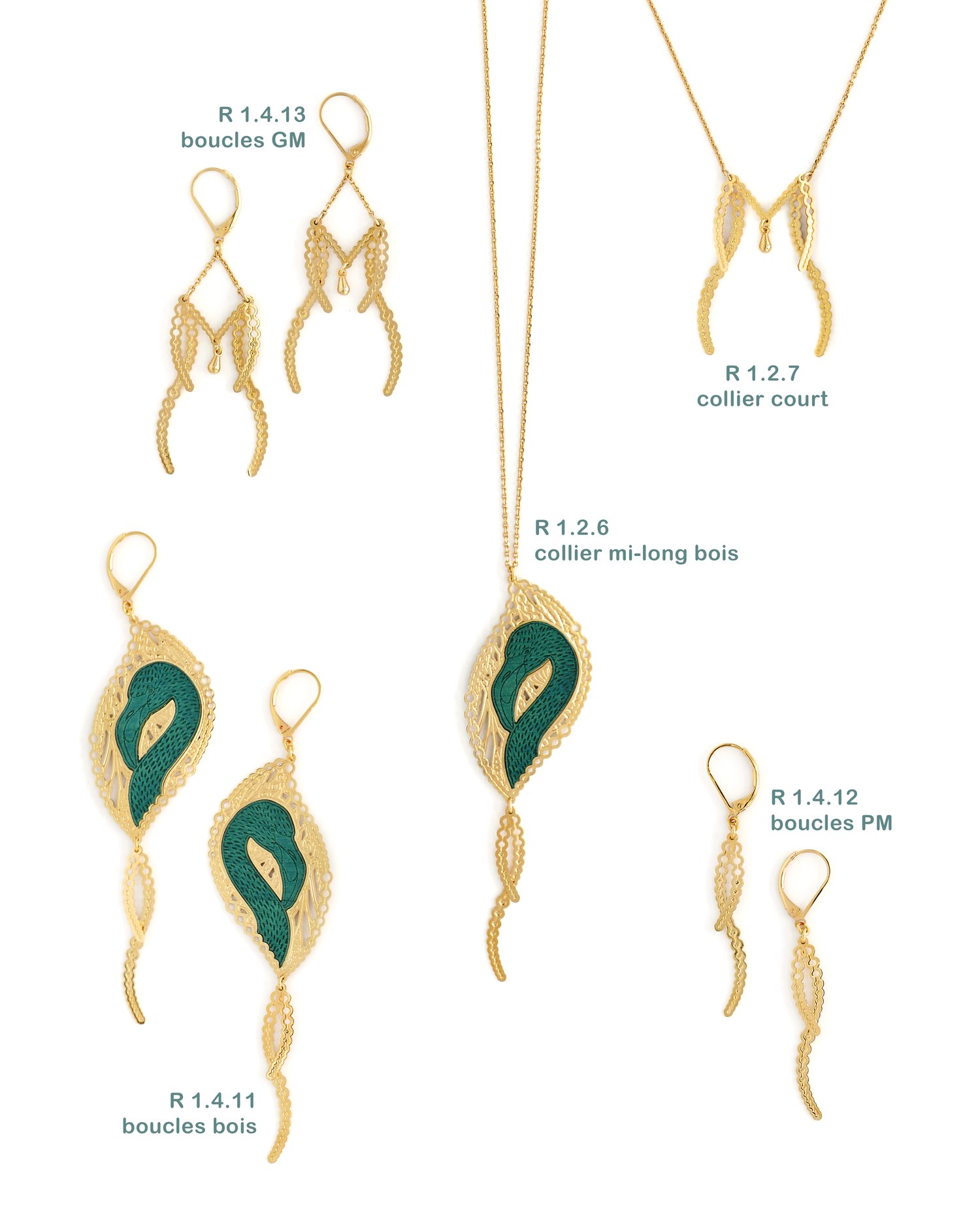 Bijoux en laiton gravé finition or et camaïeu de résines colorées.