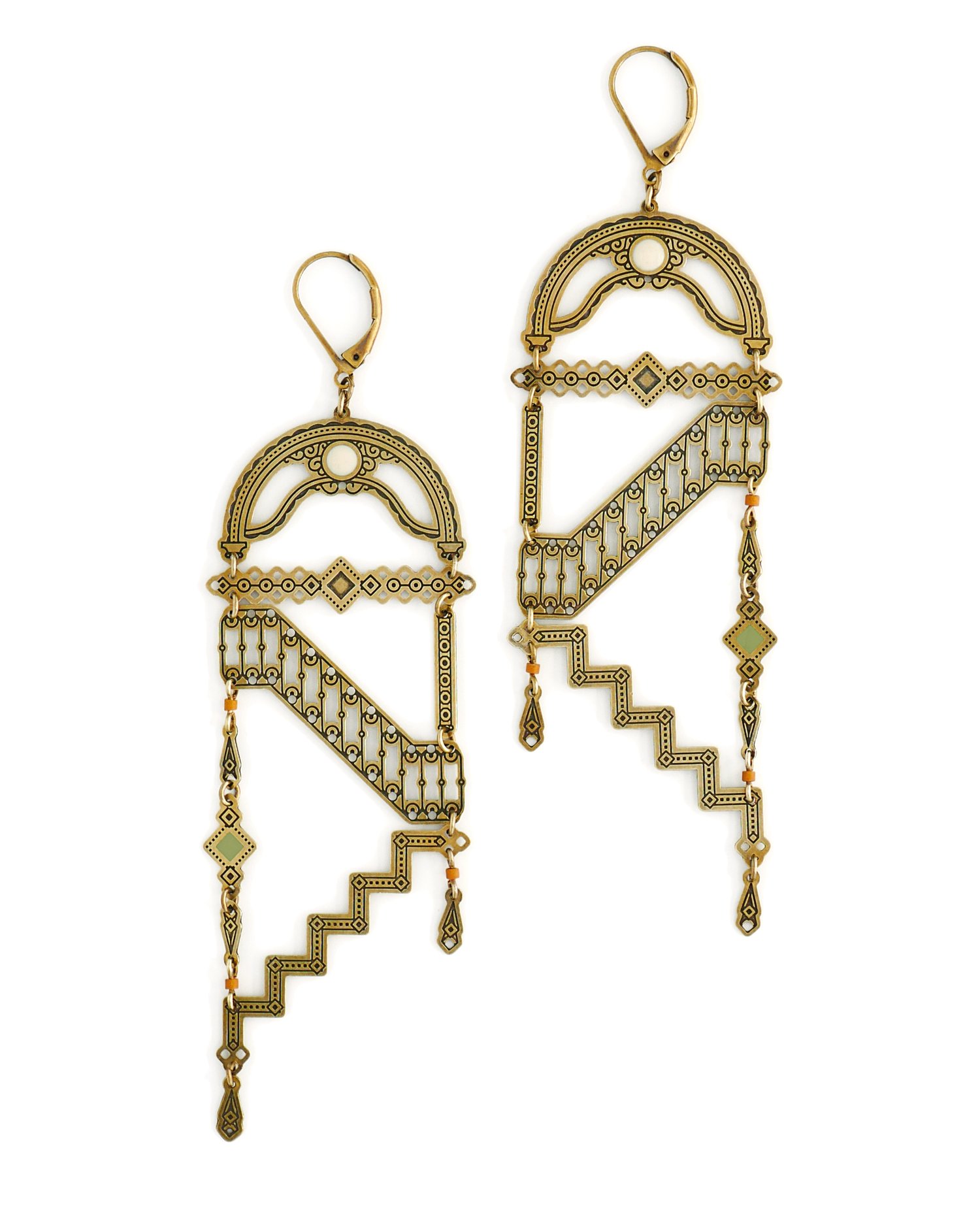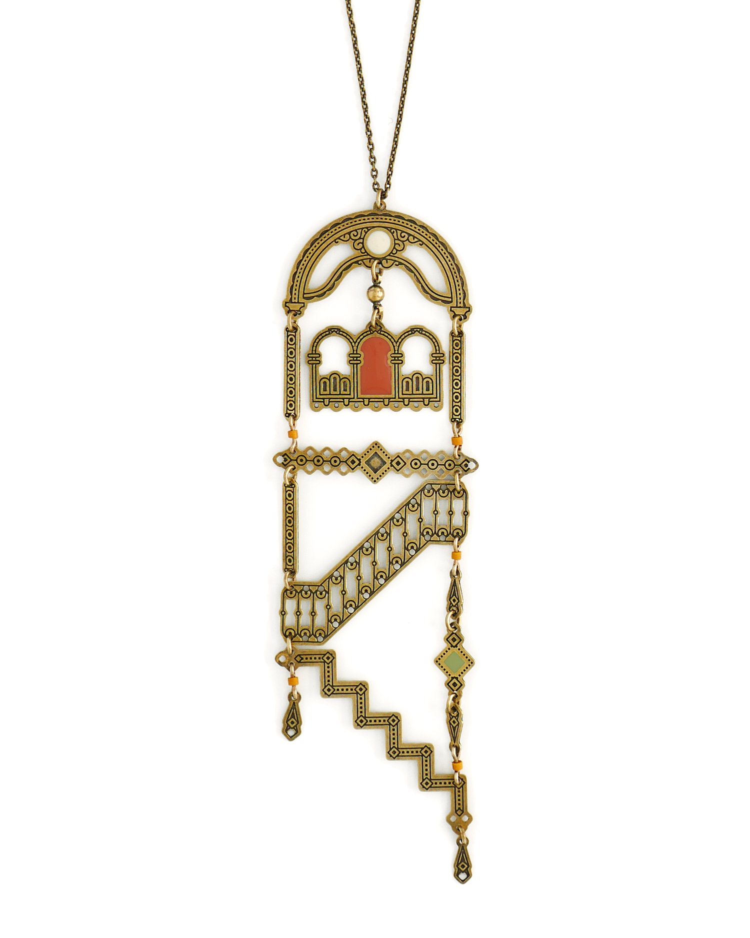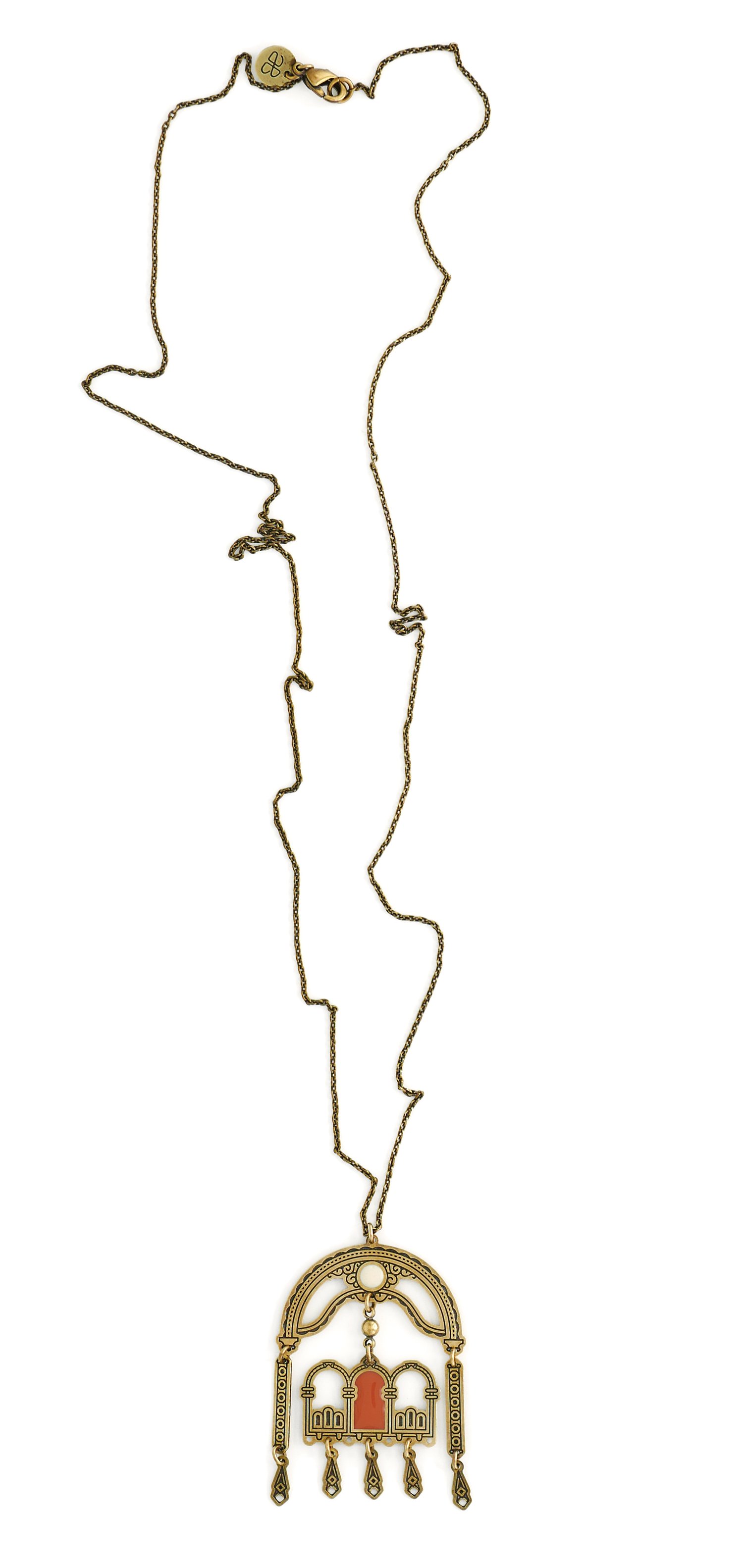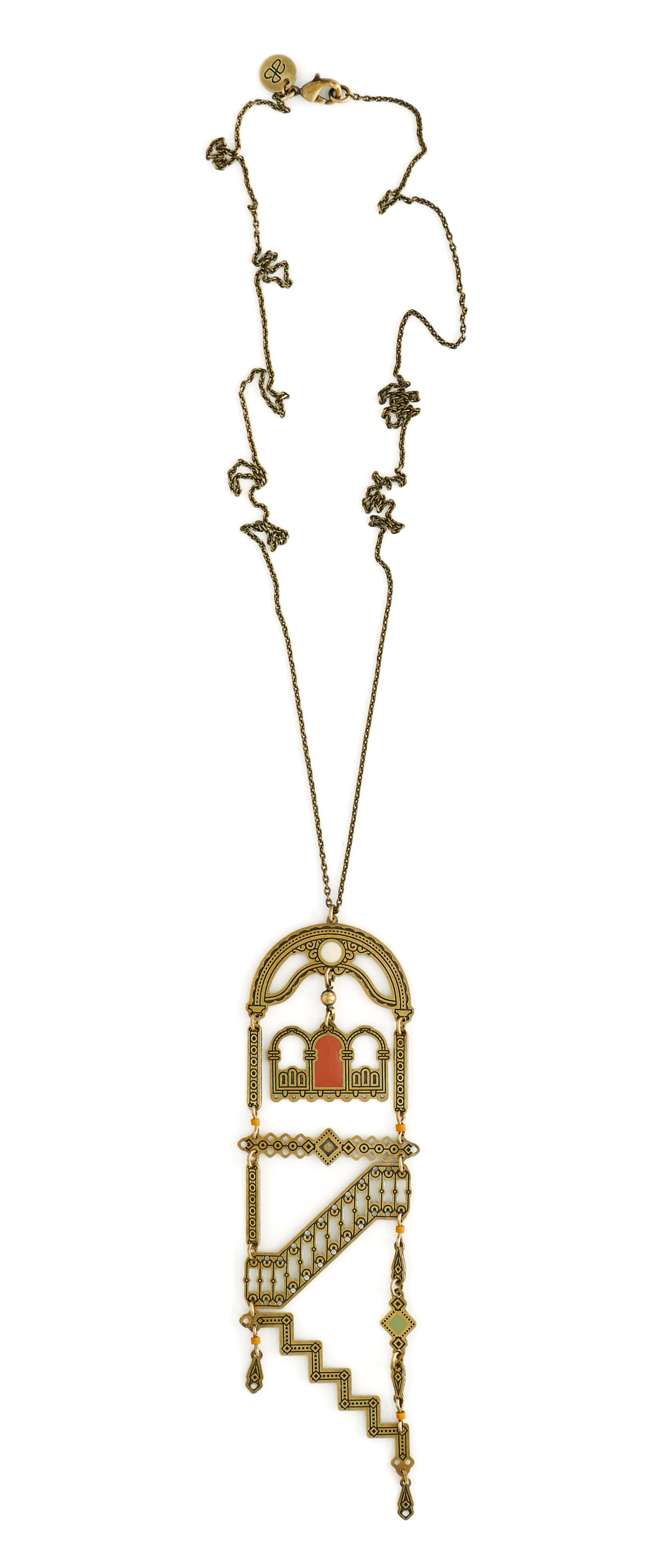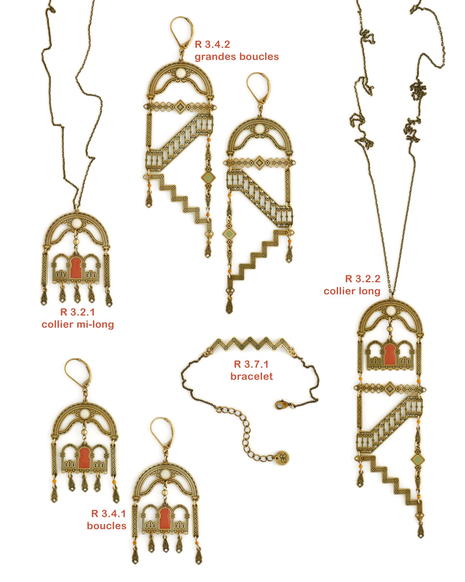 Bijoux en laiton gravé finition vieux bronze, résines couleur tomette et nacré.