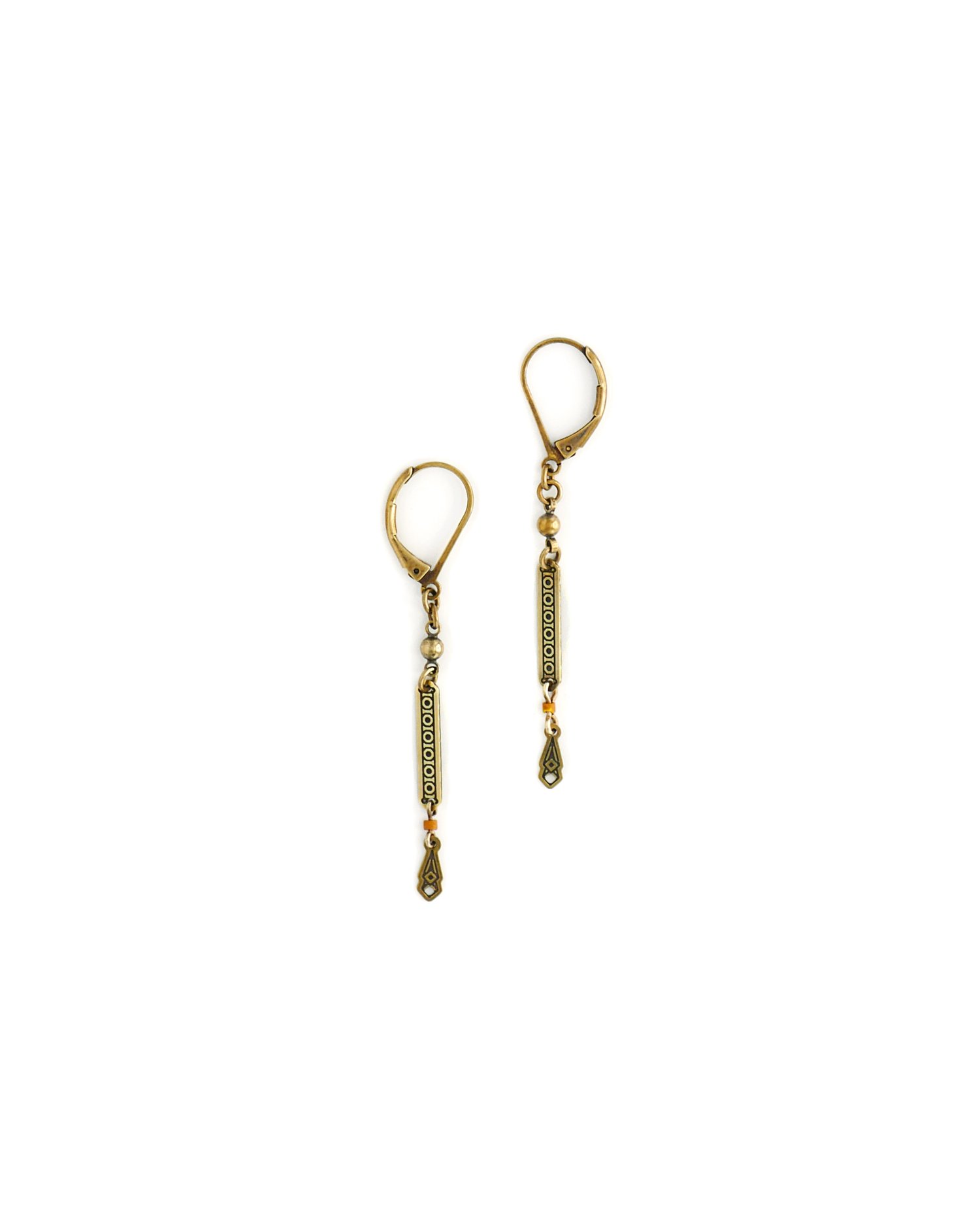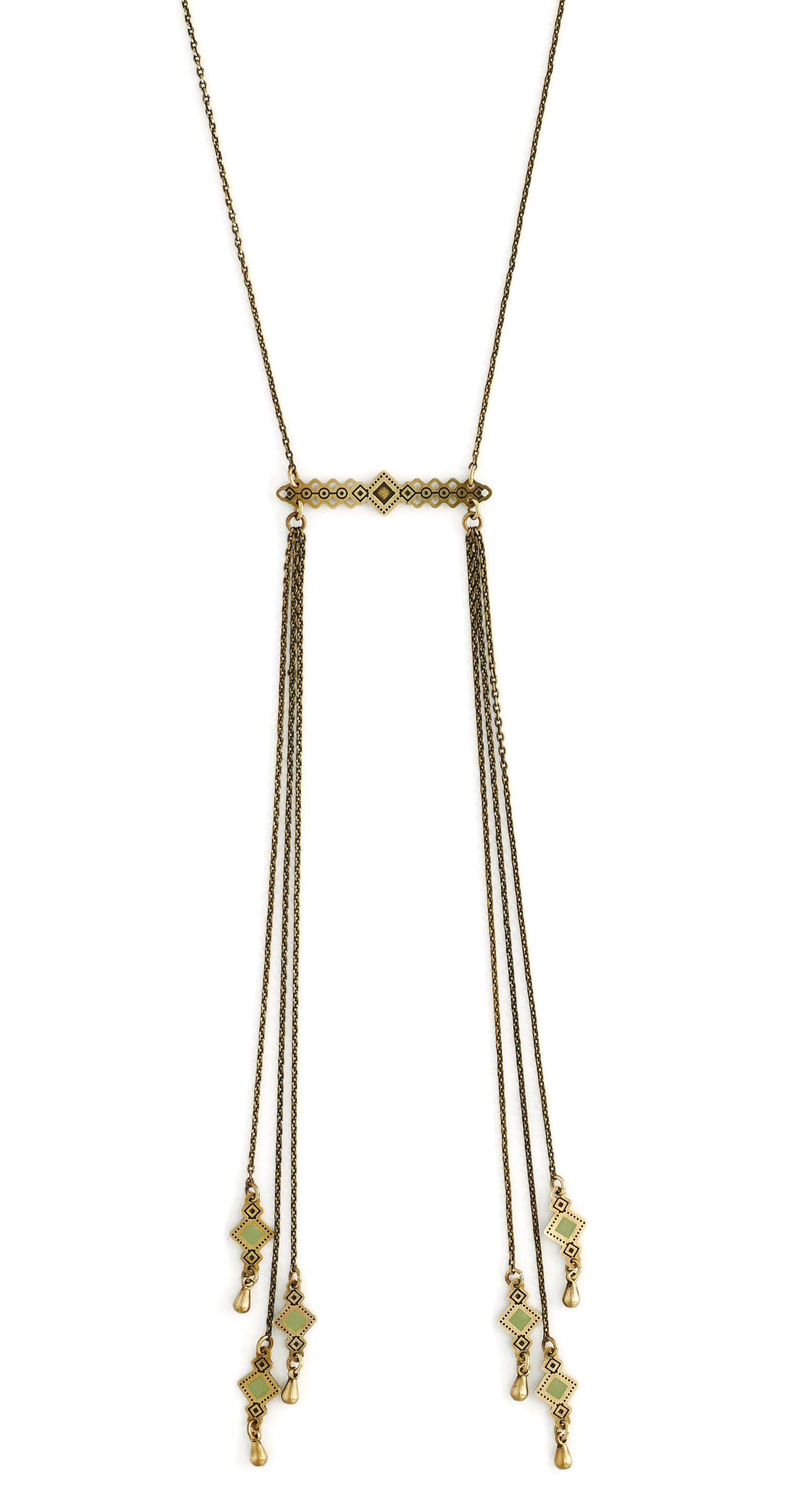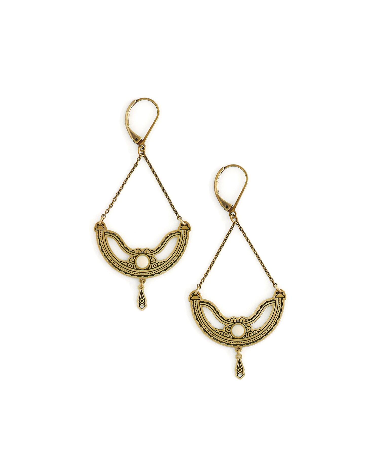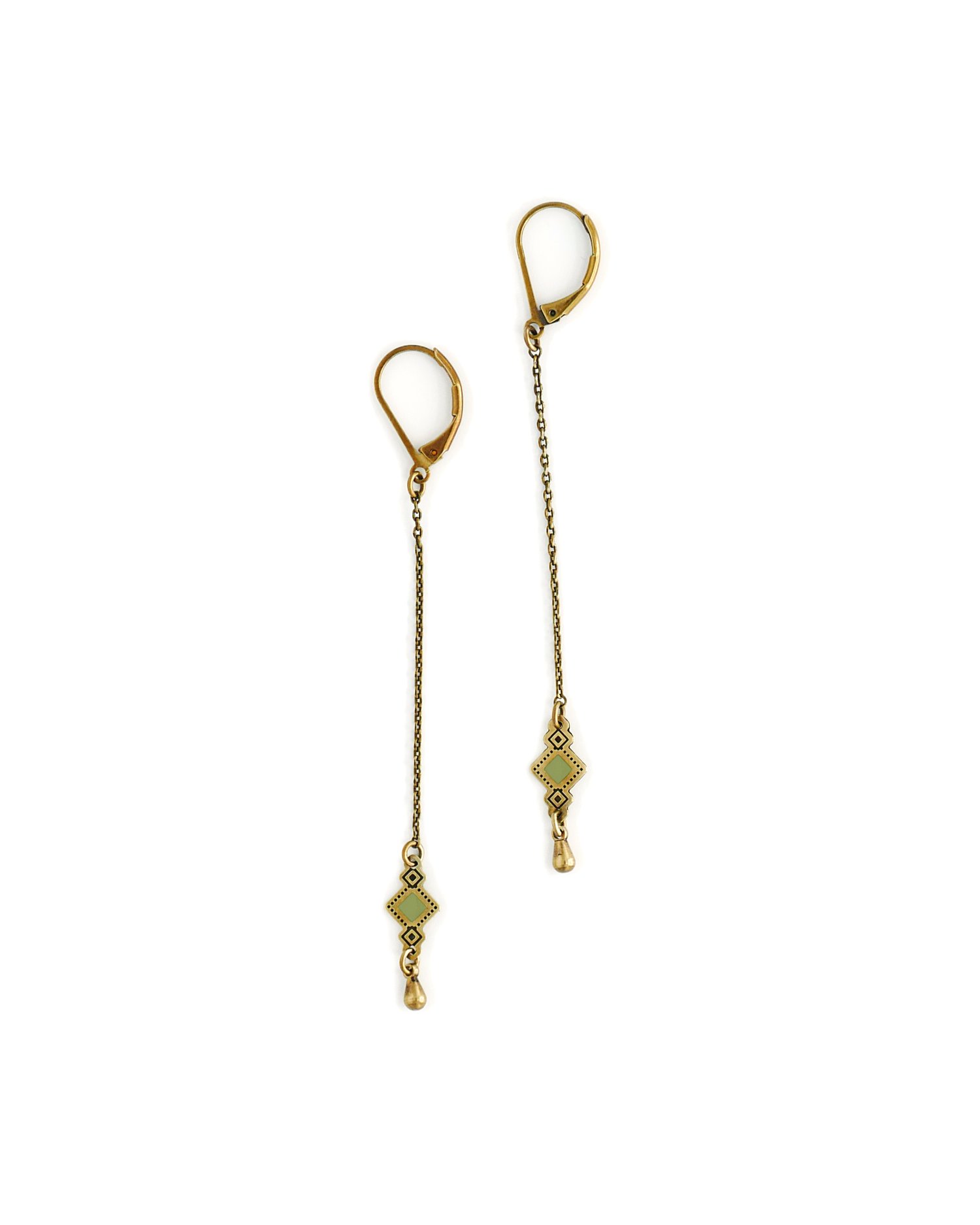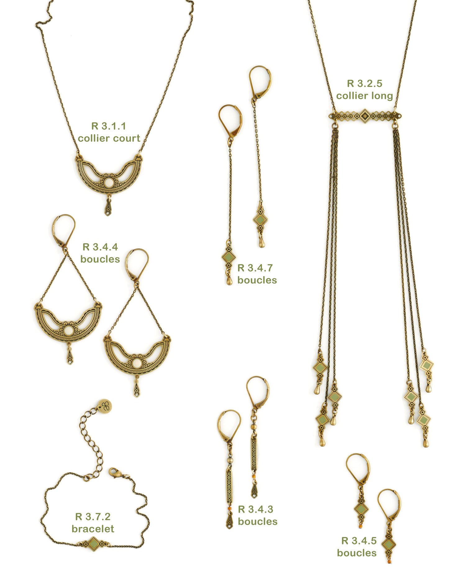 Bijoux en laiton gravé finition vieux bronze, résines couleur vert mousse et nacré.