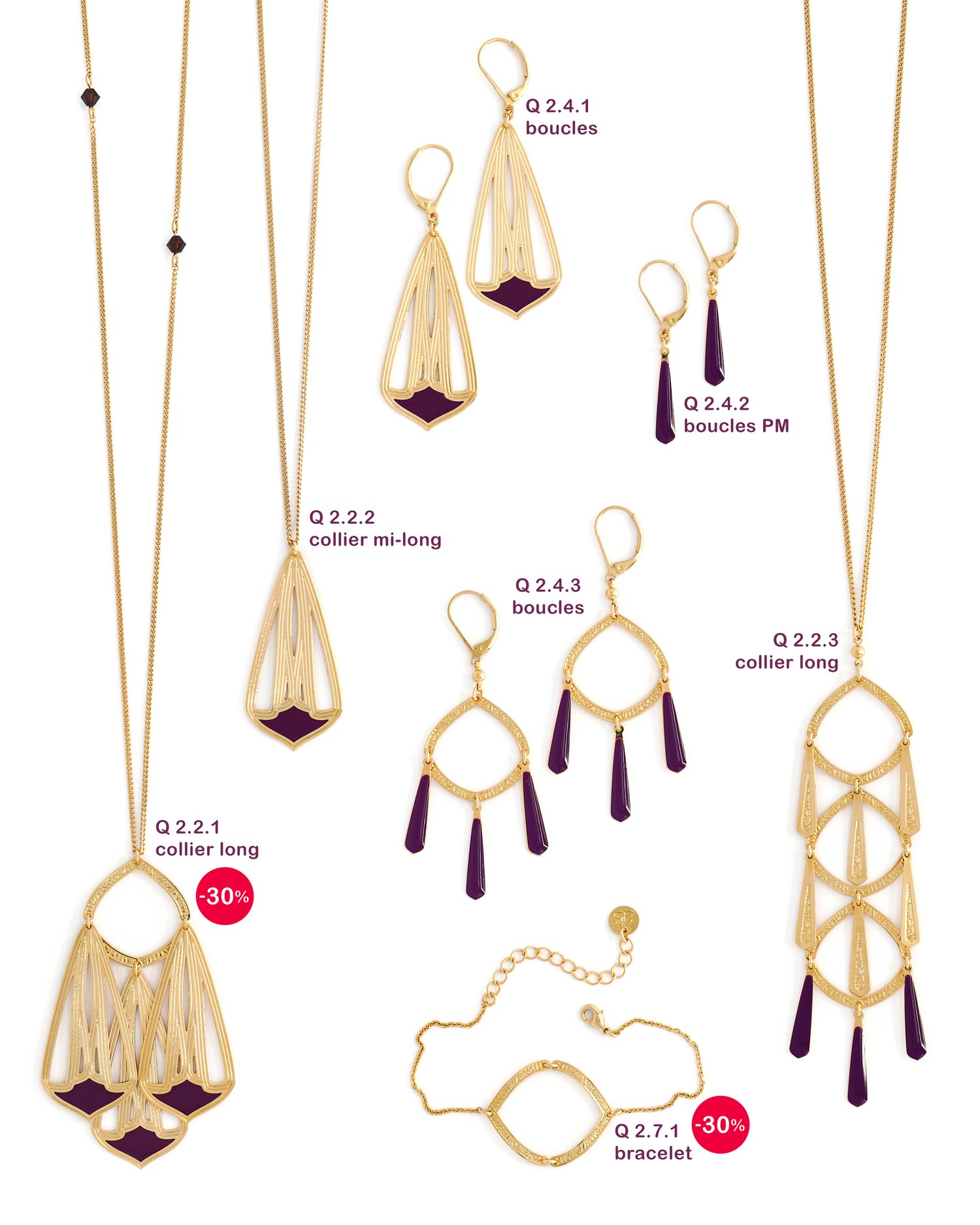 Bijoux en laiton gravé finition or et résine couleur aubergine ou vert émeraude.